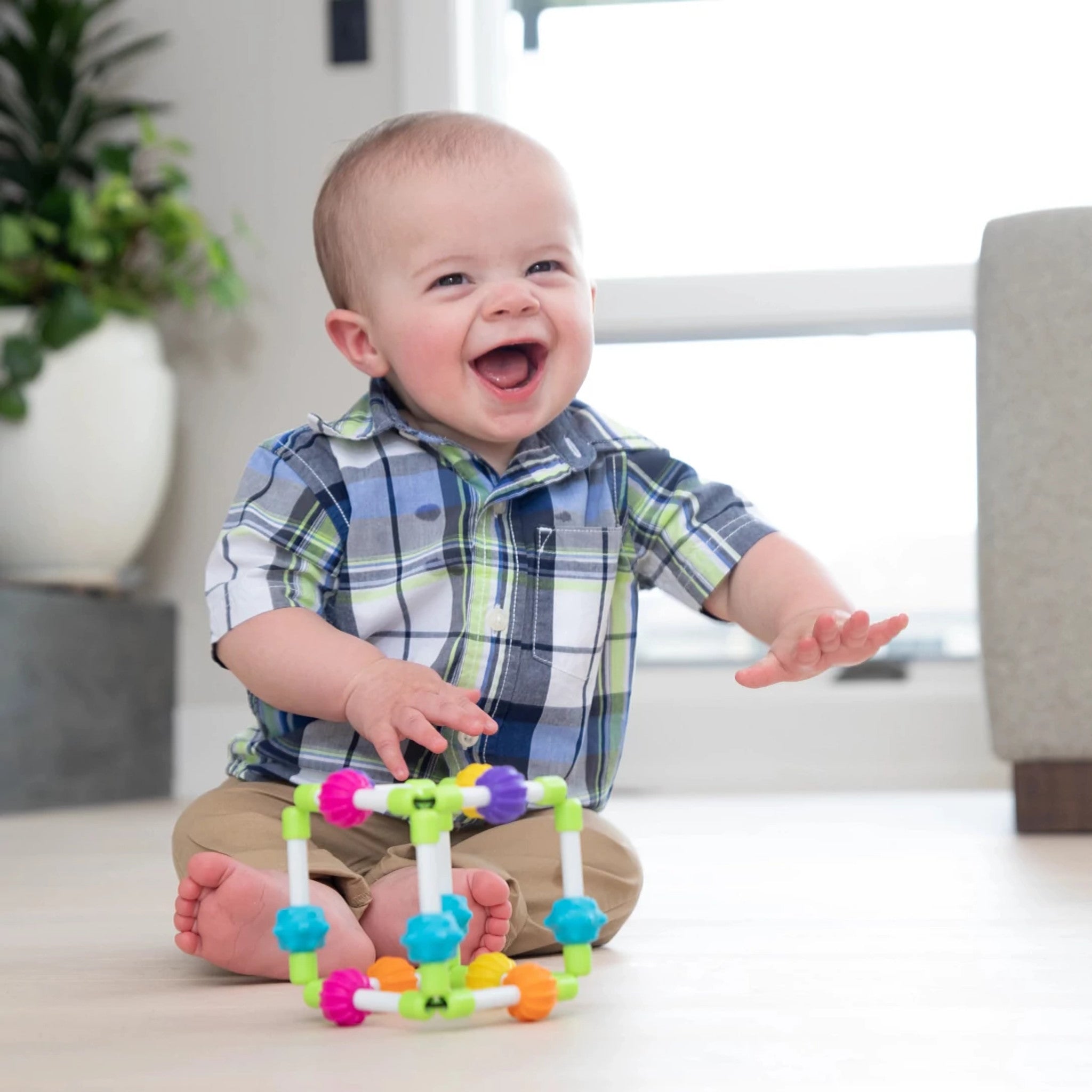Les perles à la texture caoutchouteuse, quant à elles, tournent et glissent pour accroître la fascination sensorielle. Les petits ne cessent d’explorer ! Captez leur attention et continuez à les intéresser avec Quubi.