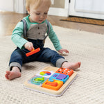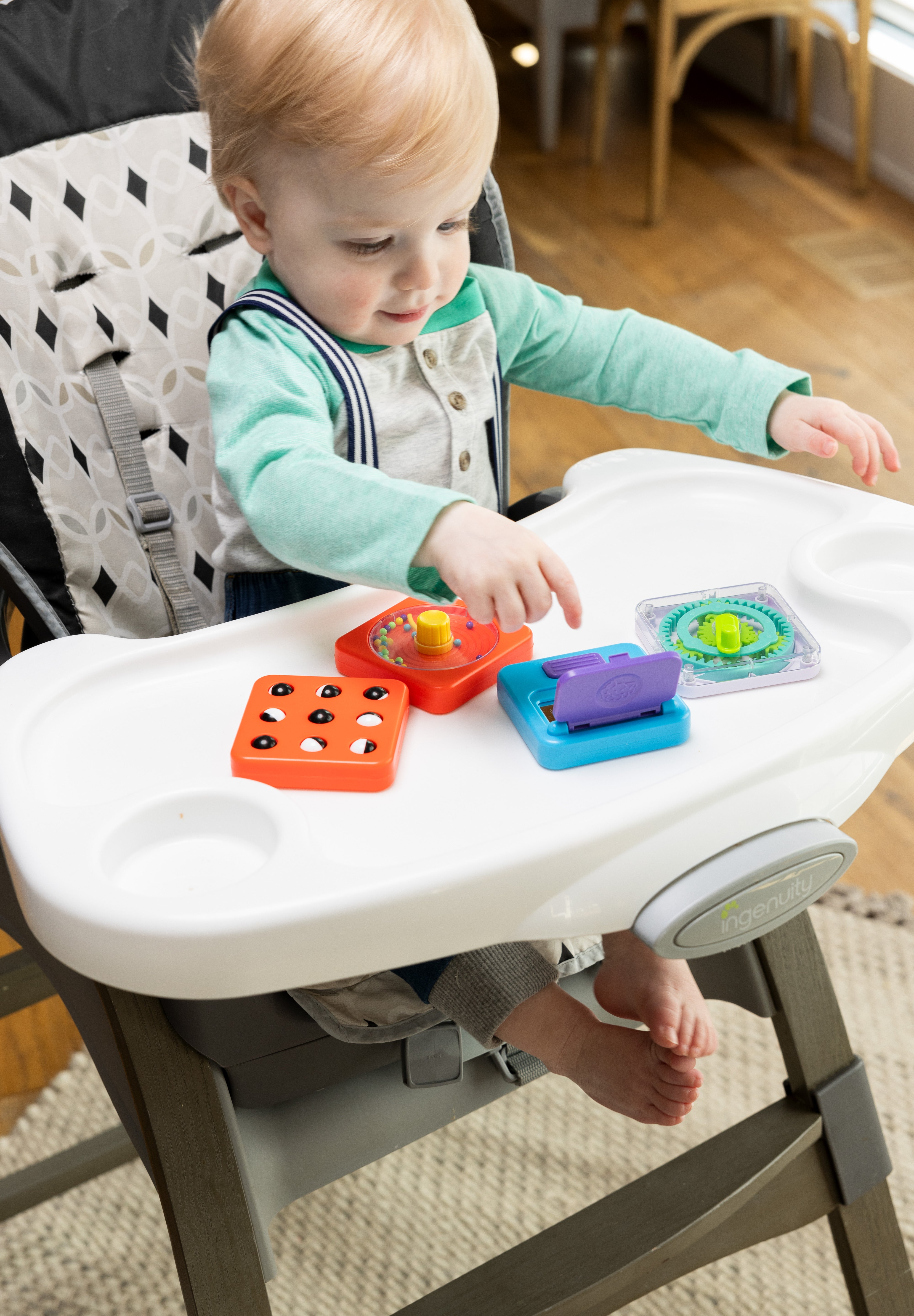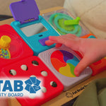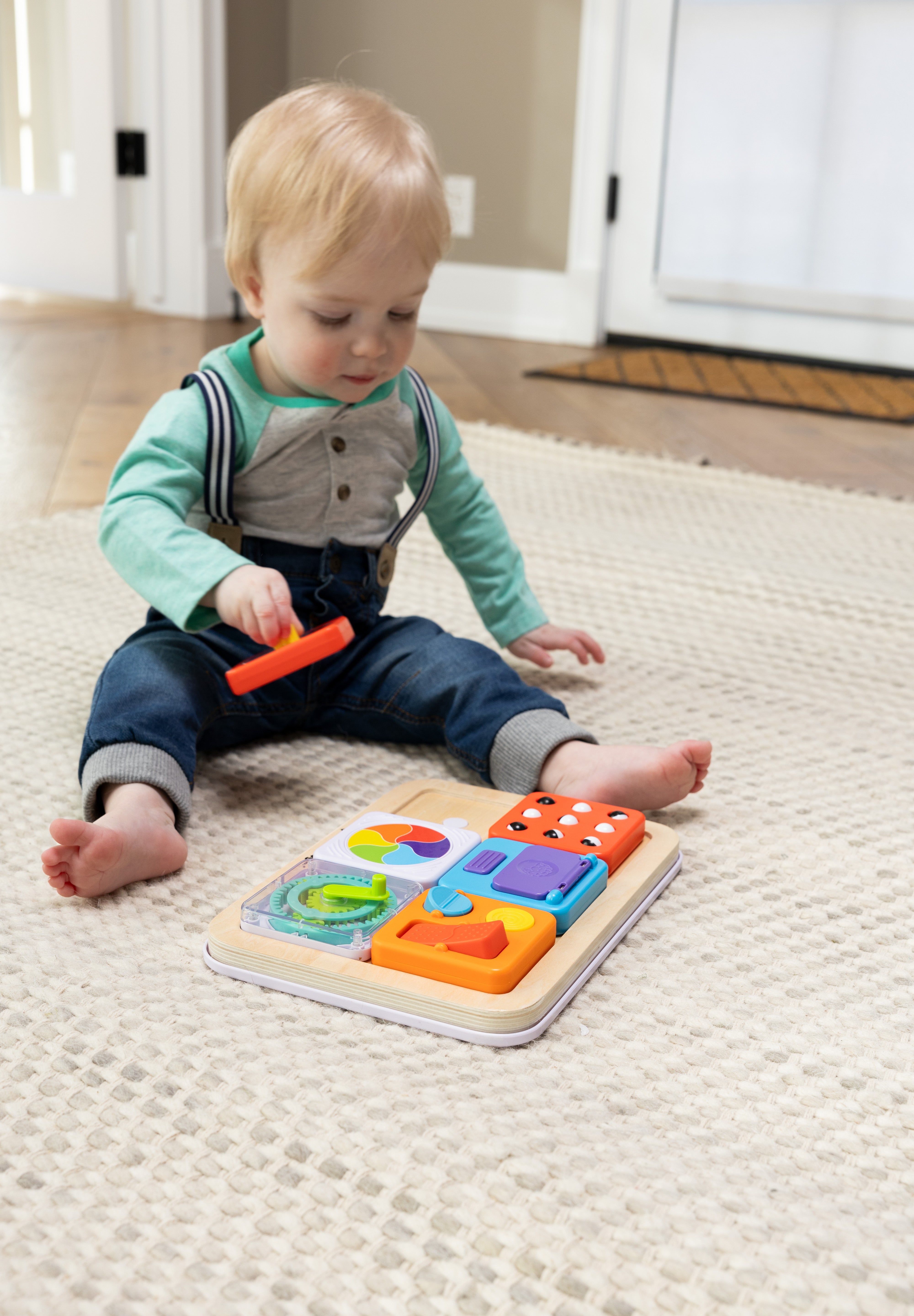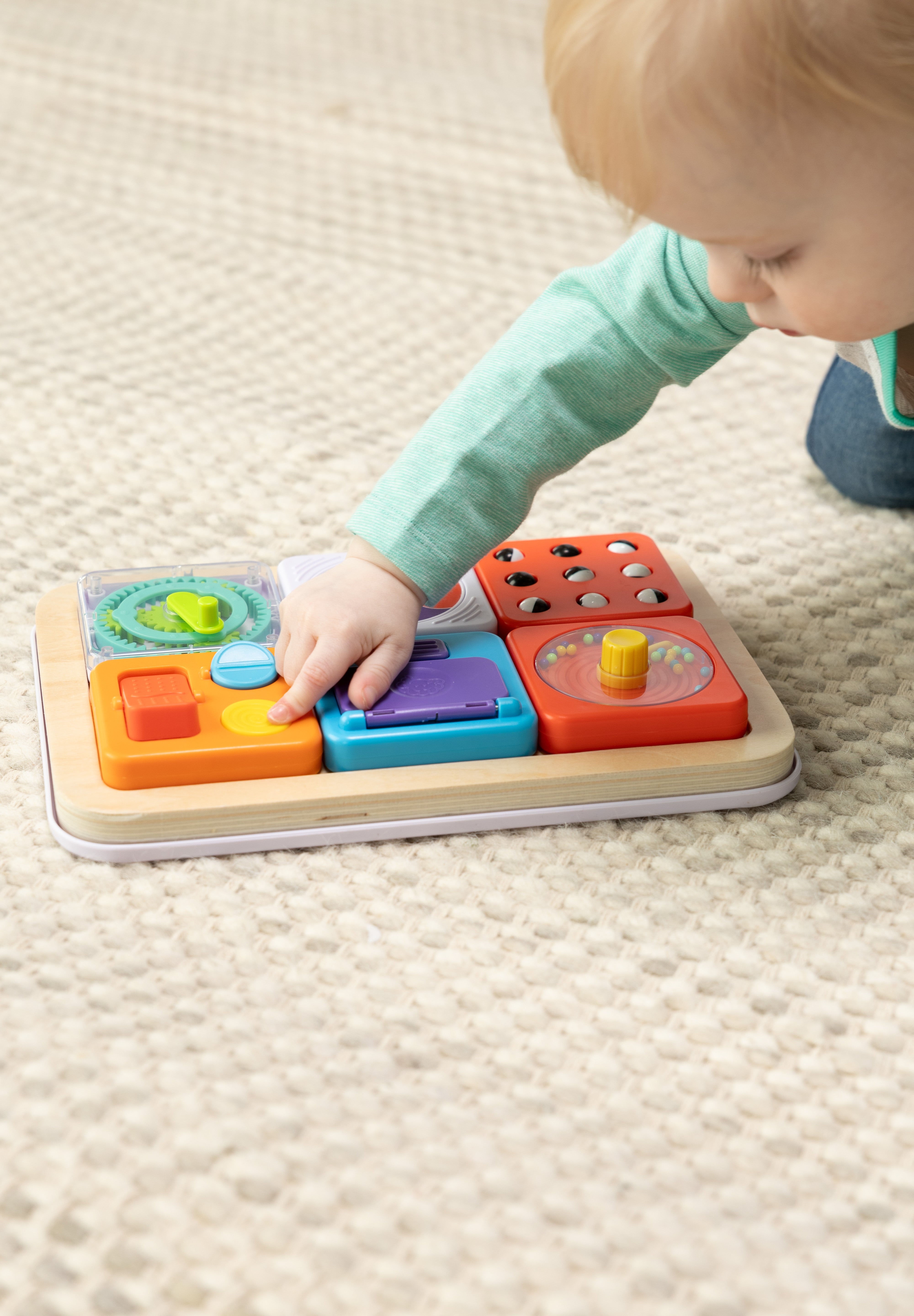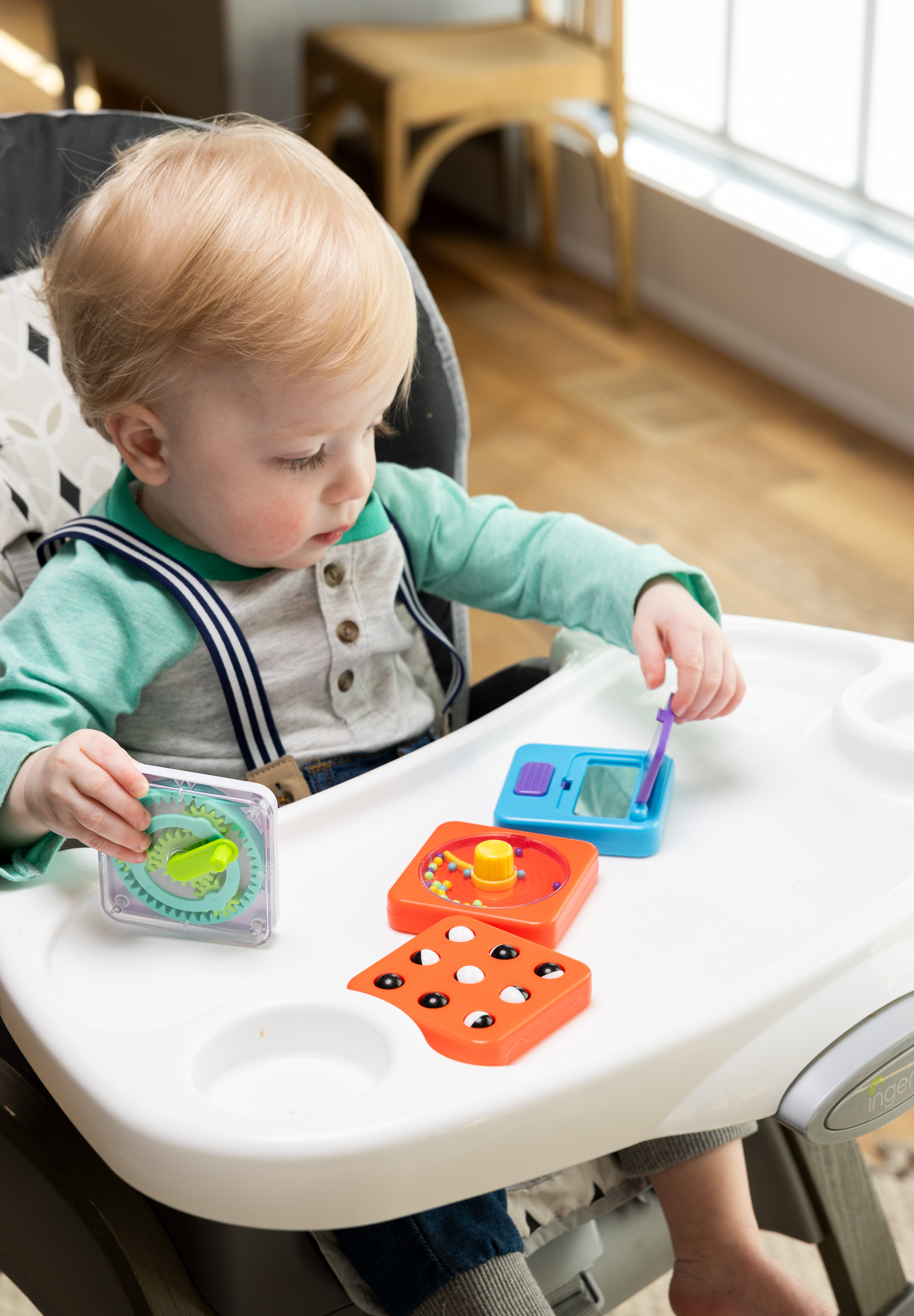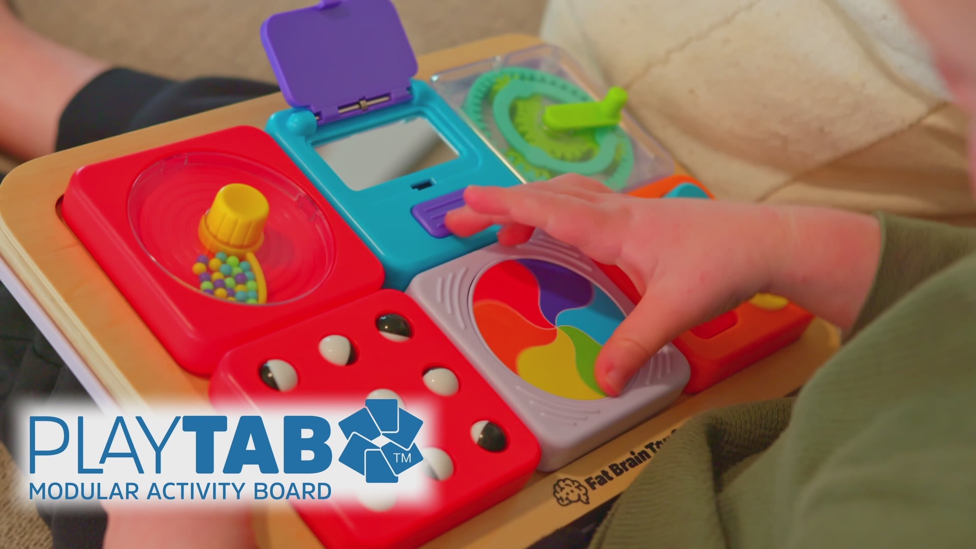 PlayTab est un jouet sensoriel modulable qui te permet de créer une expérience unique, remplie de défis pour la motricité fine, de découvertes visuelles et de jeux de cause à effet… et bien plus encore !